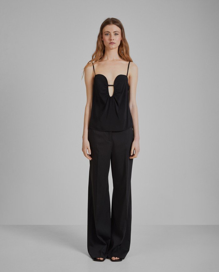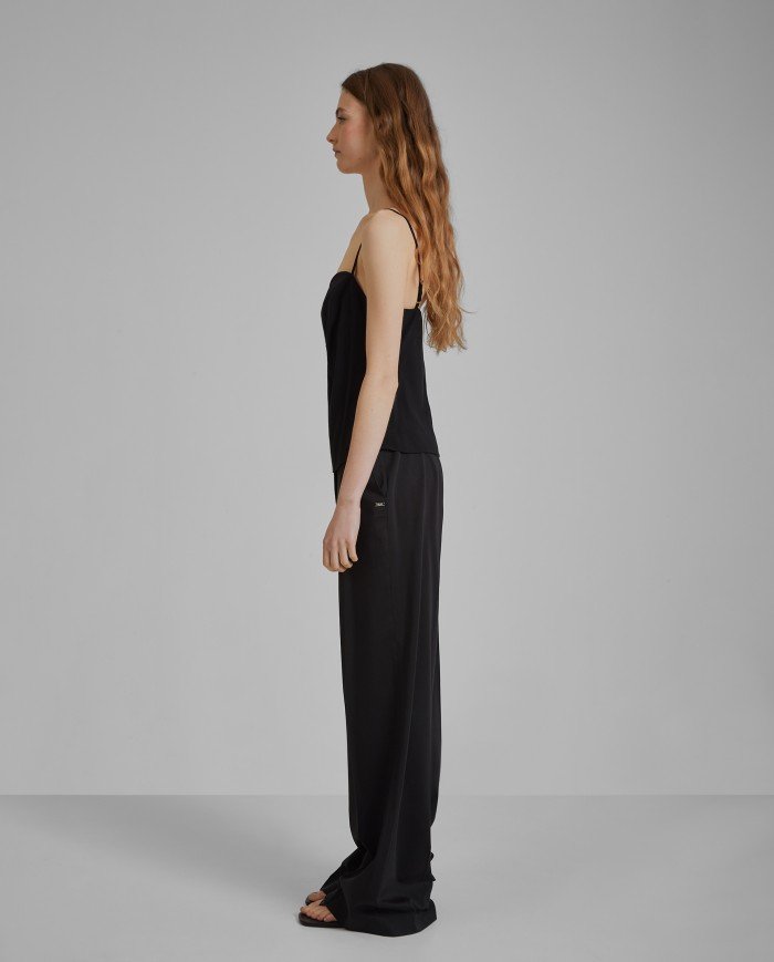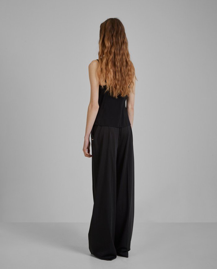 Flowing trousers without pleats with waistband and button and fly fastening.